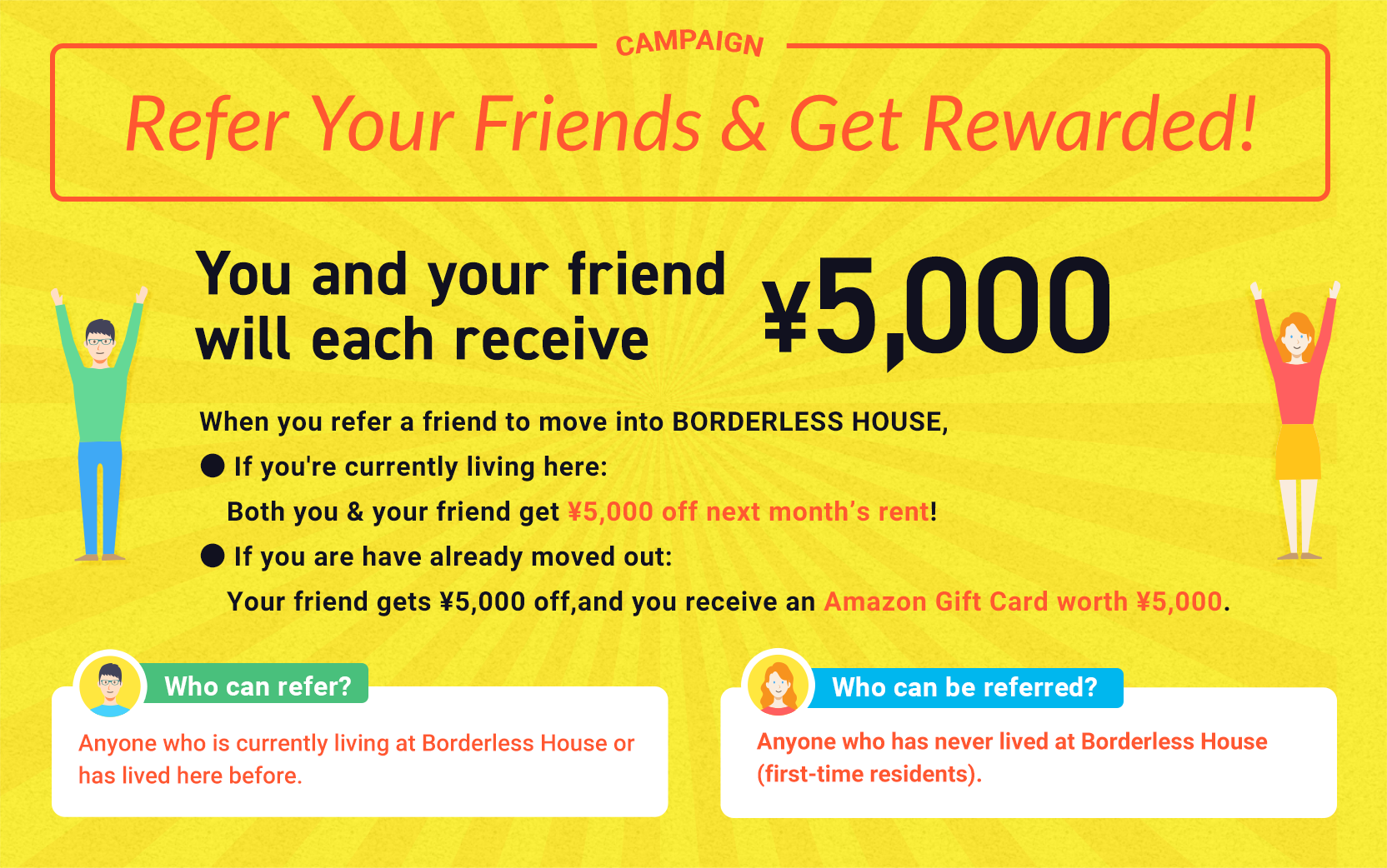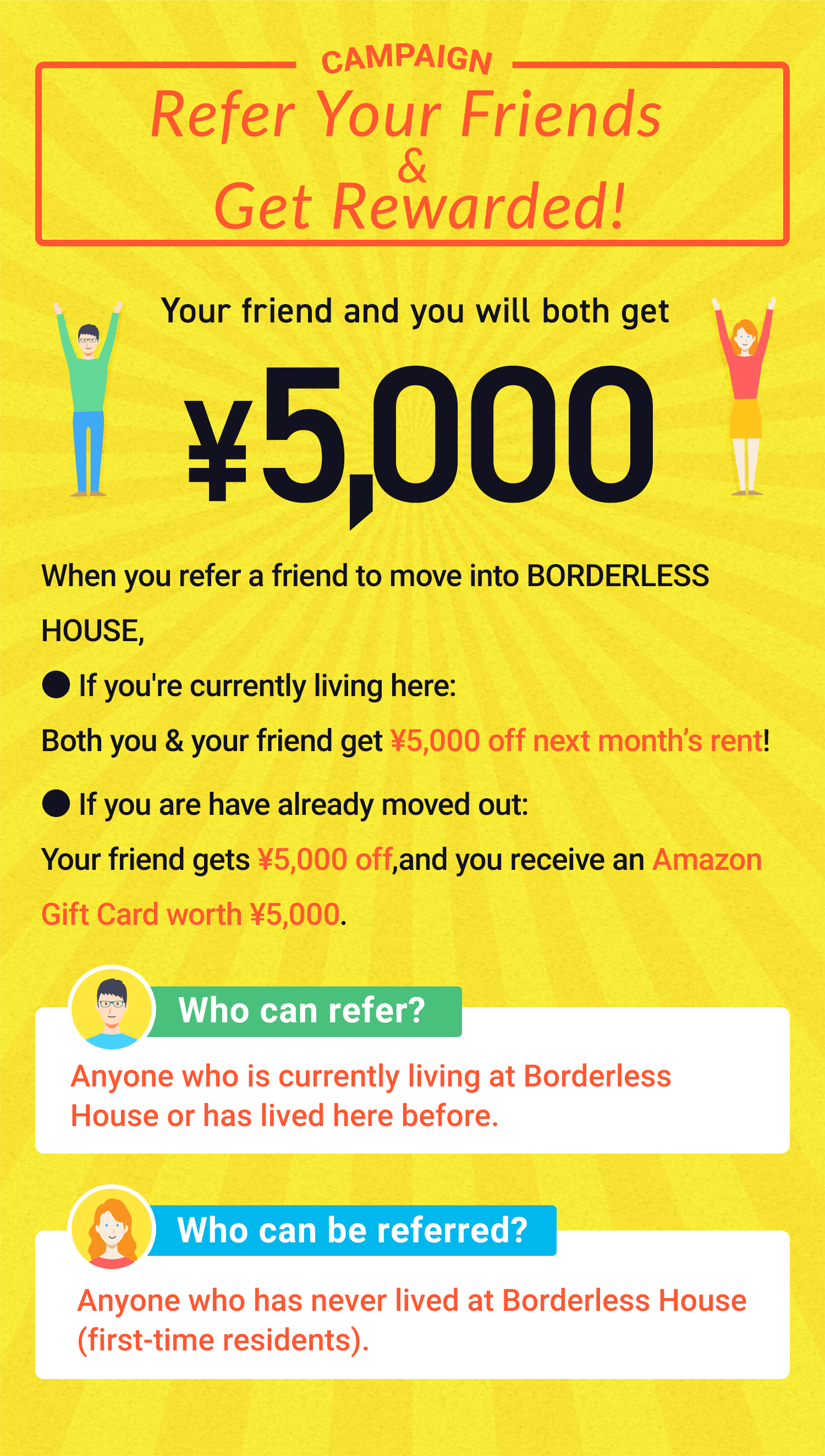 - The age limits is 18~35 years old at BORDERLESS HOUSE.Couples or married people are not allowed to move in.