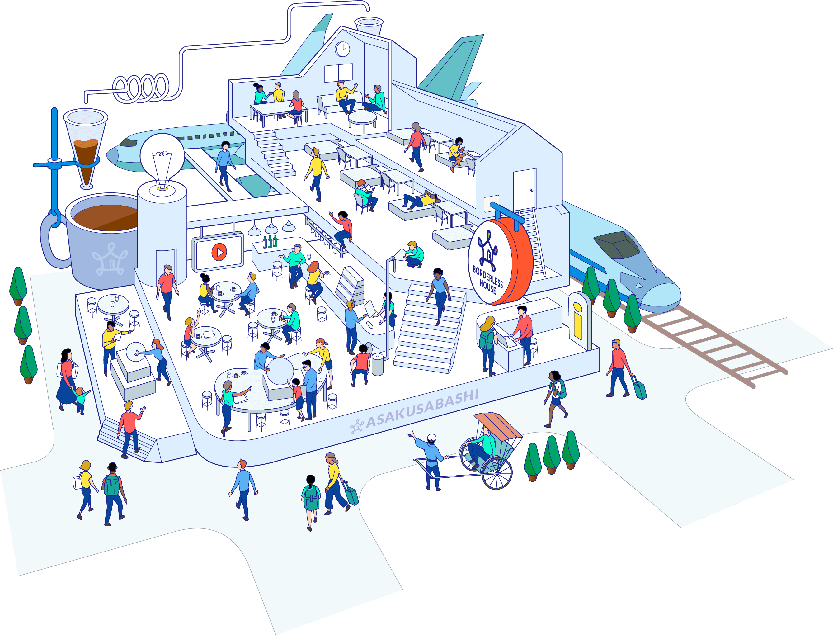 It's a space where a wide variety of people come and go and spend time together, various cultures coexist naturally.  We want to make such a great space open not only to the guests residents but also to the people from everywhere outside and the local community area.  We wantaim to create opportunities for interactions between our guests and the locals.