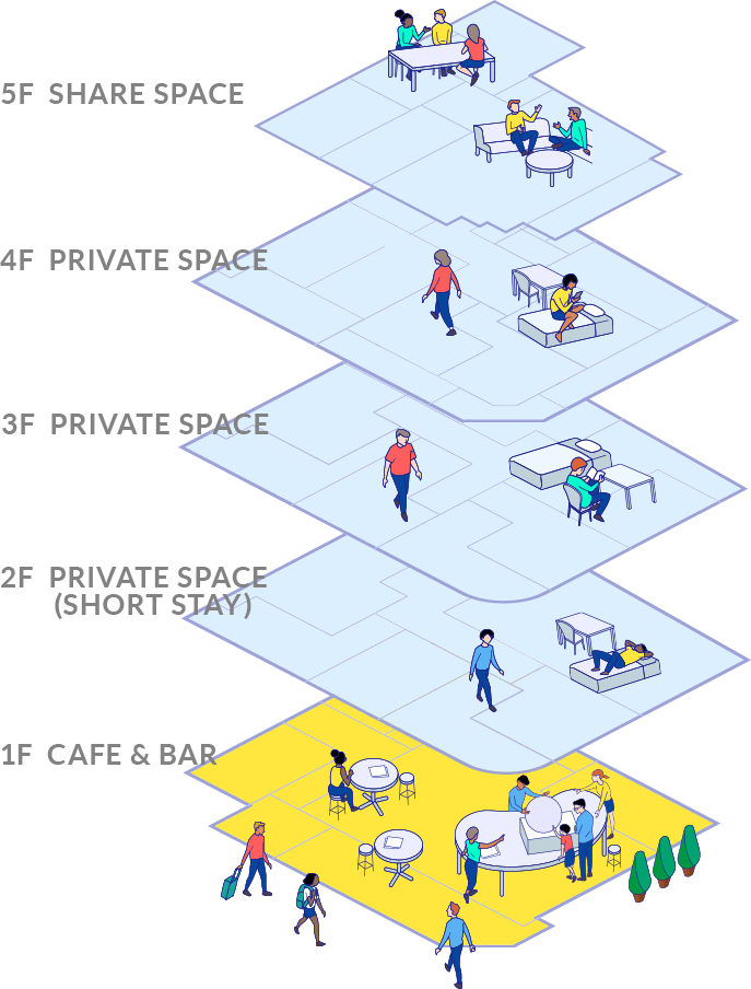 A new form of community sharehouse with an Open Space Cafe on the 1st floor  where travelers can also stay visit.
